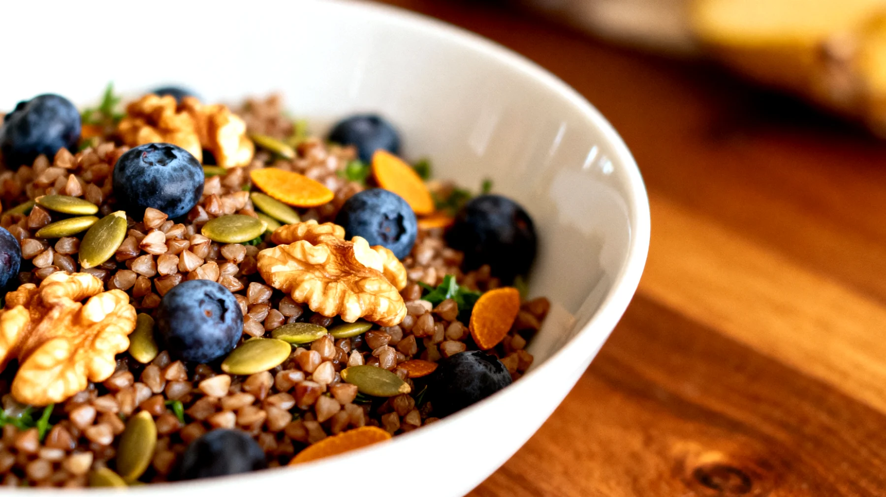 Questo piatto è particolarmente adatto come pranzo nelle giornate di studio intenso, in biblioteca o a casa. Consumato freddo, un pasto moderato in grassi saturi e ricco di carboidrati a rilascio graduale è meno associato alla tipica sonnolenza post-prandiale rispetto a pasti molto ricchi di grassi e calorie. Una combinazione di grano saraceno, noci, semi e mirtilli può facilmente fornire 8-10 grammi di fibre per porzione, contribuendo alla normale funzione intestinale e supportando la diversità del microbiota intestinale, sempre più riconosciuto come parte dell’asse intestino-cervello.