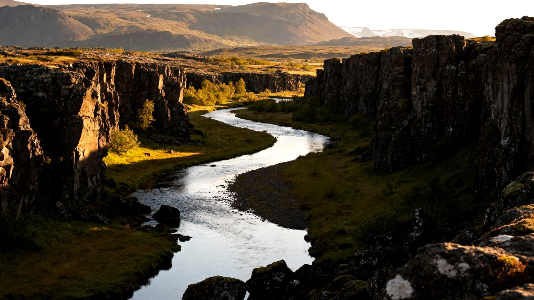 Þingvellir non è un parco nazionale qualunque. Qui si può letteralmente camminare tra due continenti, con la placca tettonica nordamericana da un lato e quella eurasiatica dall’altro. La faglia di Almannagjá crea uno scenario drammatico, con pareti di roccia vulcanica che si innalzano ai lati di un sentiero percorribile anche con bambini abituati a camminare. In inverno, le cascate come Öxarárfoss si trasformano in sculture di ghiaccio scintillante, mentre il lago Þingvallavatn, il più grande d’Islanda, si presenta parzialmente ghiacciato con riflessi argentati che cambiano con le ore.